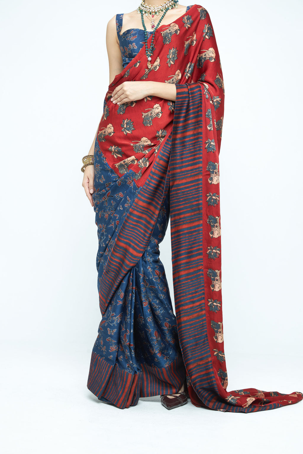 anushé pirani Modal Silk Women Indigo/Terracotta Eden Saree (Un-Stitched)