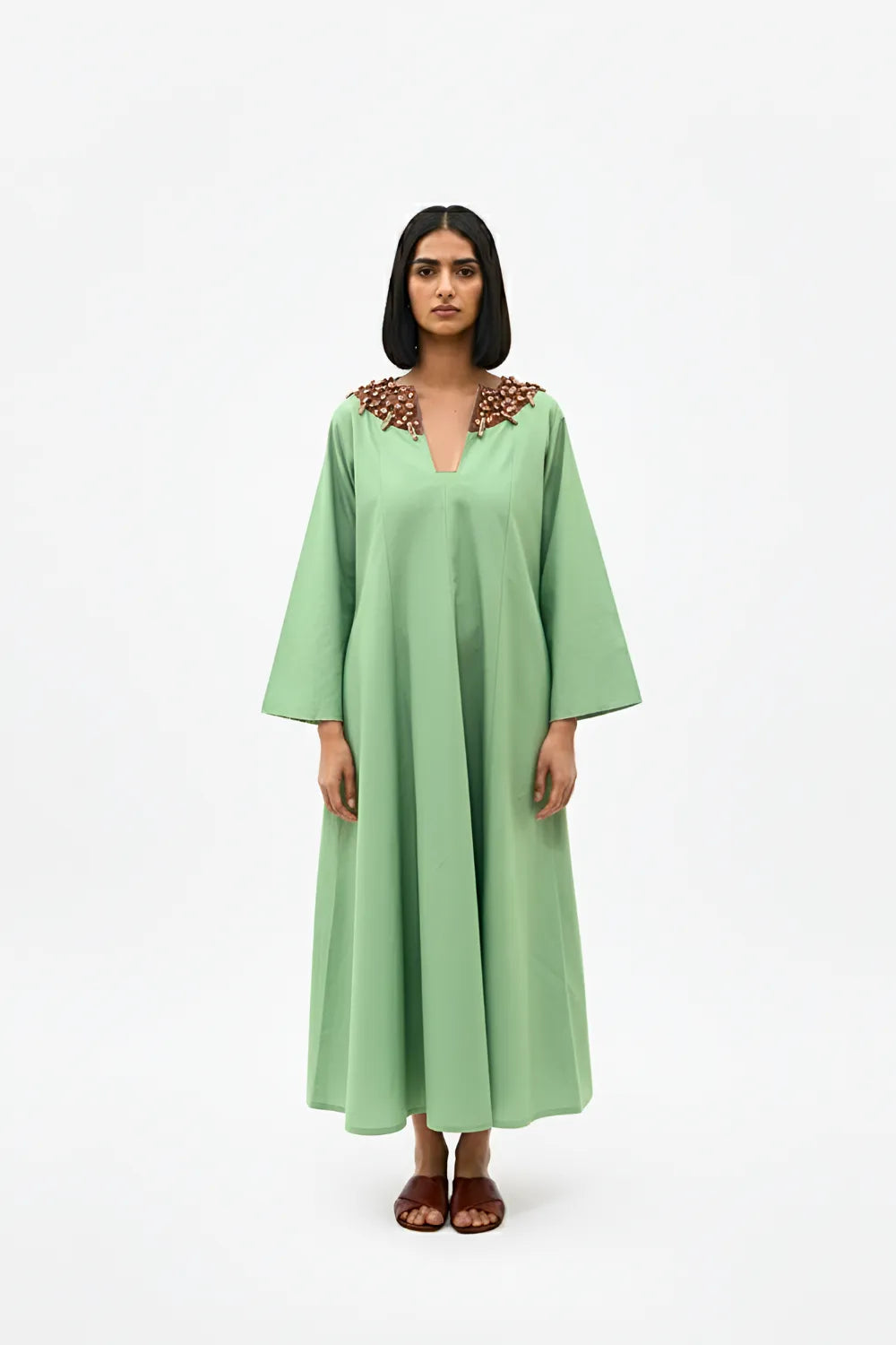 Asparagus Green-Tuscan Red Beaded Collar Maxi Dress